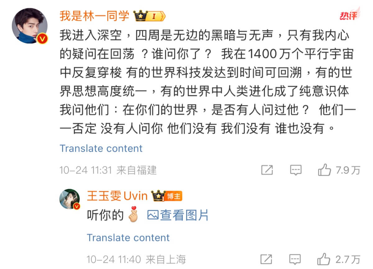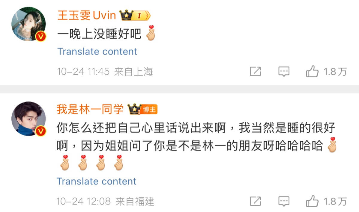 結果王玉雯又評論他:「一晚沒睡好吧!」接著林一繼續回應,表示他當然睡得很好,畢竟劉亦菲問王玉雯是不是林一的朋友!
