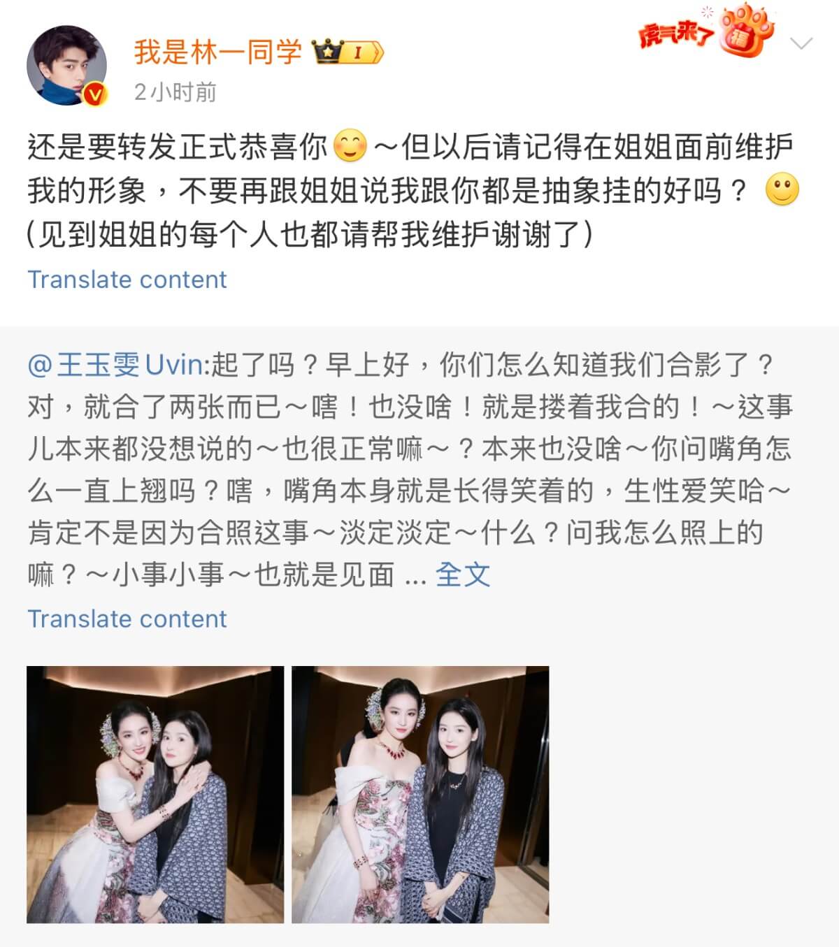 隨後他又轉發,表示要正式恭喜,但強調:「但以後請記得在姐姐面前維護我的形象。」