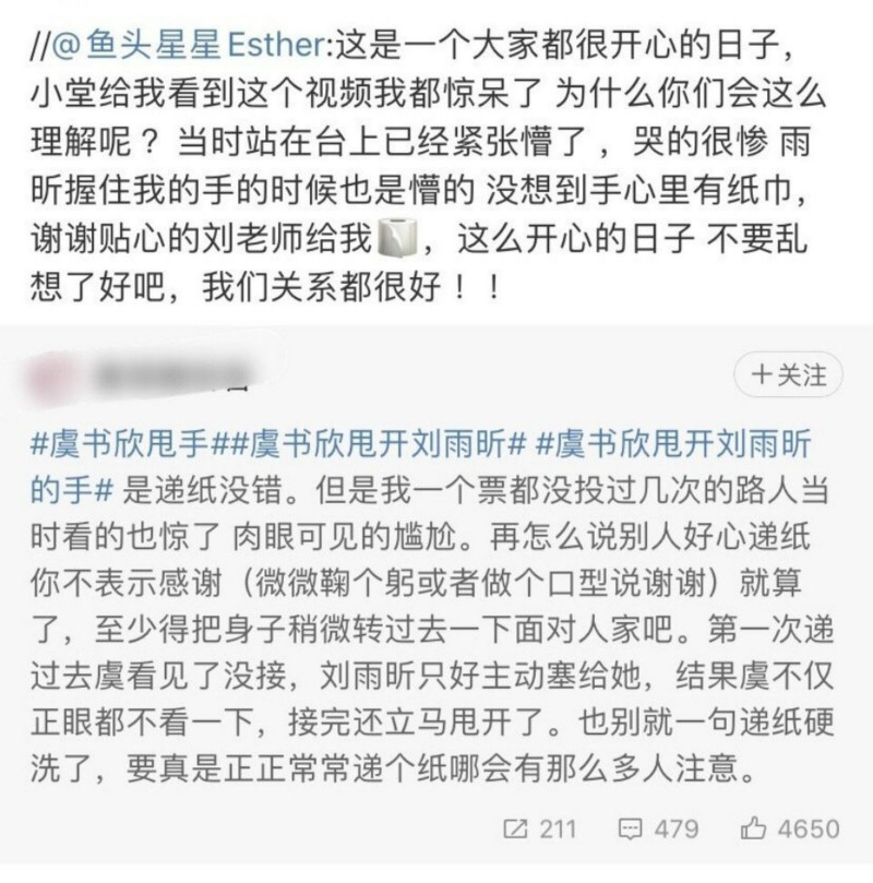 這就是網友所謂的「虞書欣甩掉劉雨昕遞上紙巾的畫面」:
