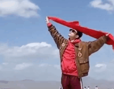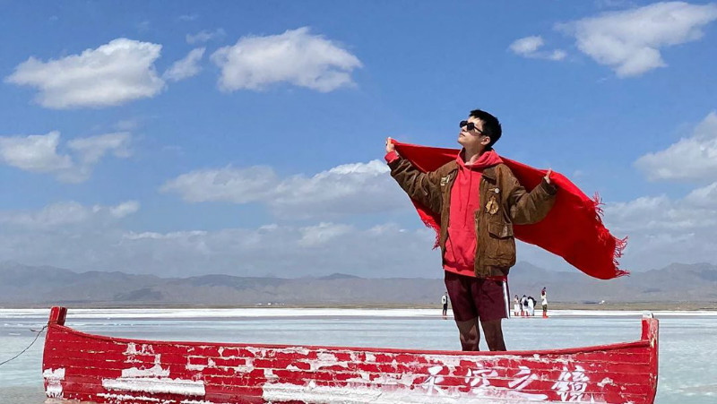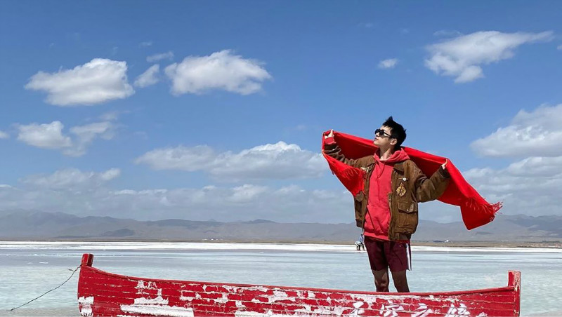 只見照片中的他披著紅絲巾迎風飄揚,站在茶卡鹽湖最著名的遊客打卡點,興致高時還高舉紅絲巾,真的是標準的夕陽老年隊的遊客Pose啊!