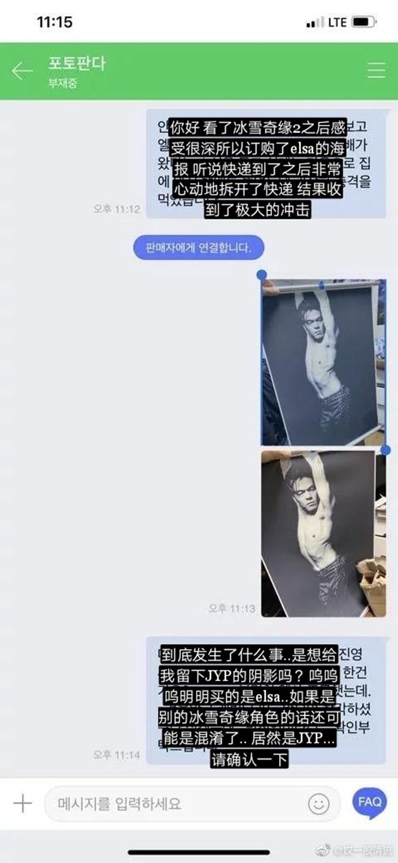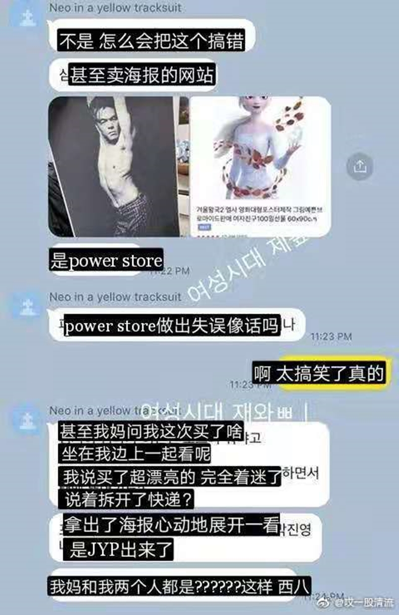 滿心期待等著海報送來後,很快地就收到心心念念的包裹,打開之後卻讓他嚇到快瘋掉,立馬傳簡訊跟原PO網友說了。原本買的Elsa海報從海報筒卷開之後,竟然發現是JYP社長朴軫永的巨型掛報!對方還告訴了原PO網友,售賣海報是評價很好的店家,很少會出錯的,怎麼可能會送錯訂單呢?!朋友甚至說母親還問他買了什麼,告訴母親「買了漂亮的」東西,沒想到兩人打開完全是被朴軫永的海報嚇傻。