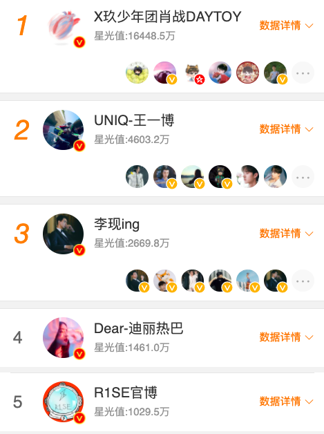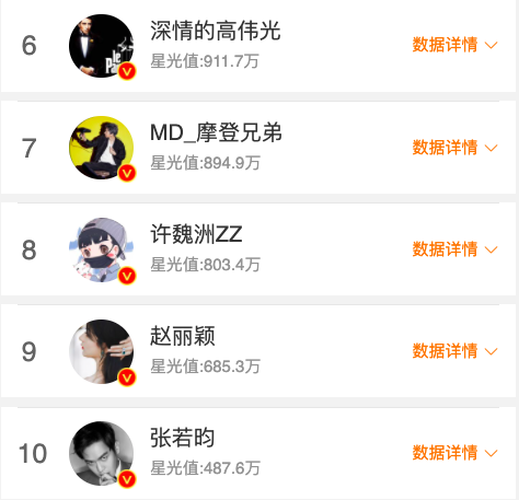 現在也來看看最新的騰訊星光大賞排行榜Top 10!排名第一的是肖戰、第二王一博、第三李現、第四迪麗熱巴、第五R1SE、第六高偉光、第七摩登兄弟劉宇寧、第八許魏洲、第九趙麗穎,第十張若昀!