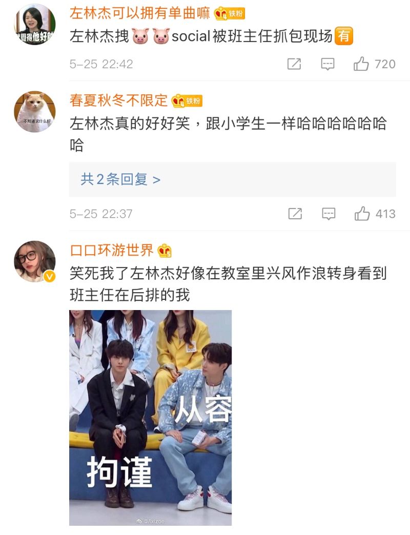「左林杰拽🐷🐷social被班主任抓包現場🈶️」、「左林杰真的好好笑,跟小學生一樣哈哈哈哈哈哈哈」、「笑死我了左林杰好像在教室裏興風作浪轉身看到班主任在後排的我」