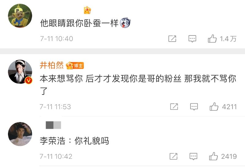 但沒想到熱評第一居然是…:「他眼睛跟你臥蠶一樣!」哈哈哈哈哈哈哈哈哈哈哈哈哈哈哈哈哈哈哈哈哈哈哈哈哈哈哈哈哈哈哈哈哈哈哈哈!奪筍啊!井柏然也忍不住回復:「本來想罵你,後才發現你是哥的粉絲,那我就不罵你了!」噗!原來我們井寶罵人之前,還會去翻人家的主頁查看的啊?
