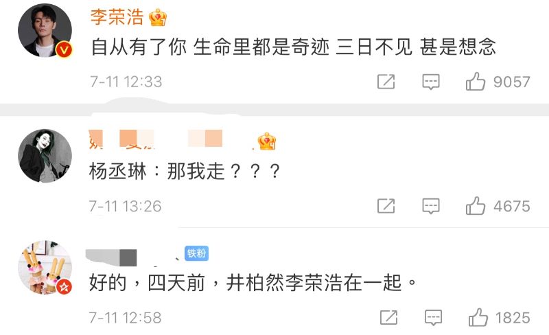 而李榮浩也來井寶這裡留言,表示:「自從有了你,生命裡都是奇迹,三日不見,甚是想念。」結果粉絲奪筍模式再開,紛紛留言:「楊丞琳:那我走???」、「好的,四天前,井柏然李榮浩在一起!」