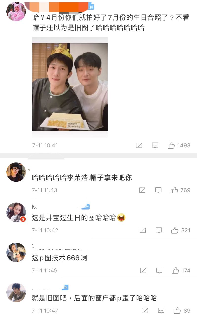 最好笑的是,居然有粉絲沒看出這張合照時井寶的P圖!「哈?4月份你們就拍好了7月份的生日合照了?不看帽子還以為是舊圖了哈哈哈哈哈哈哈!」於是其他粉絲紛紛回復:「哈哈哈哈哈李榮浩:帽子拿來吧你!」、「這是井寶過生日的圖哈哈哈!」、「這p圖技術666啊!」、「就是舊圖吧,後面的窗戶都p歪了哈哈哈!」