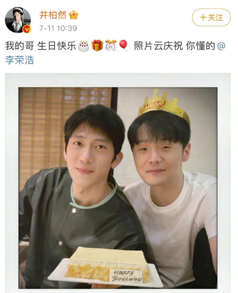 隨後合作了電影變成超級親辜的井柏然,也發文為李榮浩慶生並曬了合影:「我的哥 生日快樂🎂🎁🎊🎈 照片雲慶祝 你懂的!」