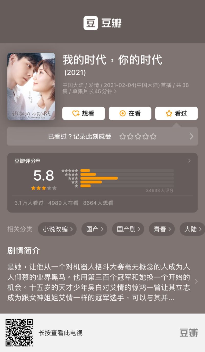這部原本叫《親愛的、摯愛的》的《你的時代,我的時代》,是2019年大熱劇《親愛的,摯愛的》姐妹篇!該劇改編自墨寶非寶的原著小說《密室困游魚》,是親愛的系列的第二部,主要講述了吳白與艾情之間,兩人在相互扶持和競爭中,被彼此吸引的愛情故事。