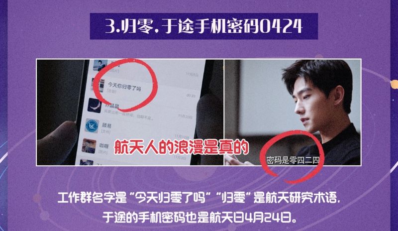 3. 很多人都猜到了的,于途的手機密碼「0424」是中國航天日4月24日,而微信中出現過的「今天你歸零了嗎」原來是工作群啊!果然很符合航天人設啊!