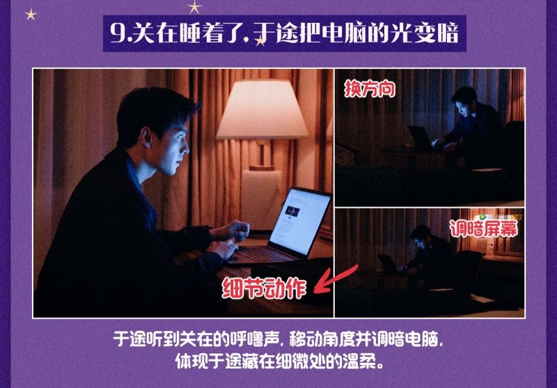 9. 于途的溫柔!在西安和關在同房時,由於留意到關在睡著了,所以于途換了個方向看電腦,避免熒幕光直接反射到關在臉上,甚至還調暗了熒幕光。