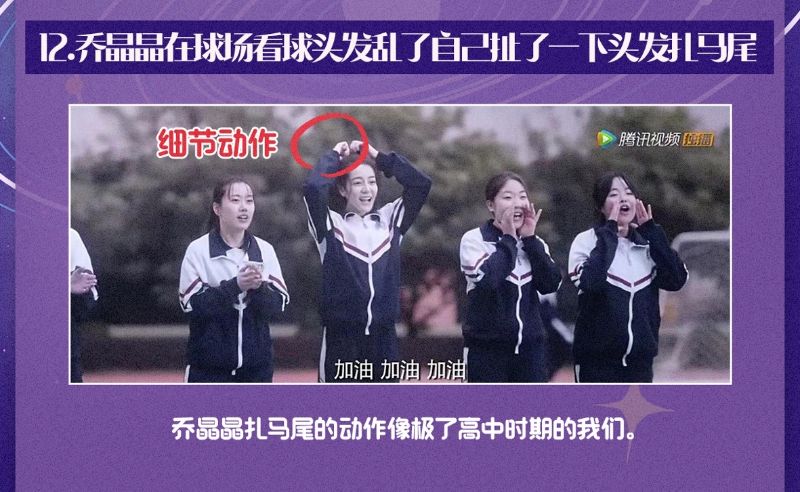 12. 高中時喬晶晶在球場看于途打籃球時,頭髮亂了就隨意扯了自己的頭髮扎起馬尾,是長髮高中女生都做過的下意識動作!