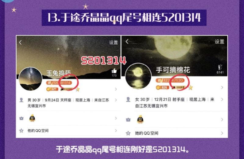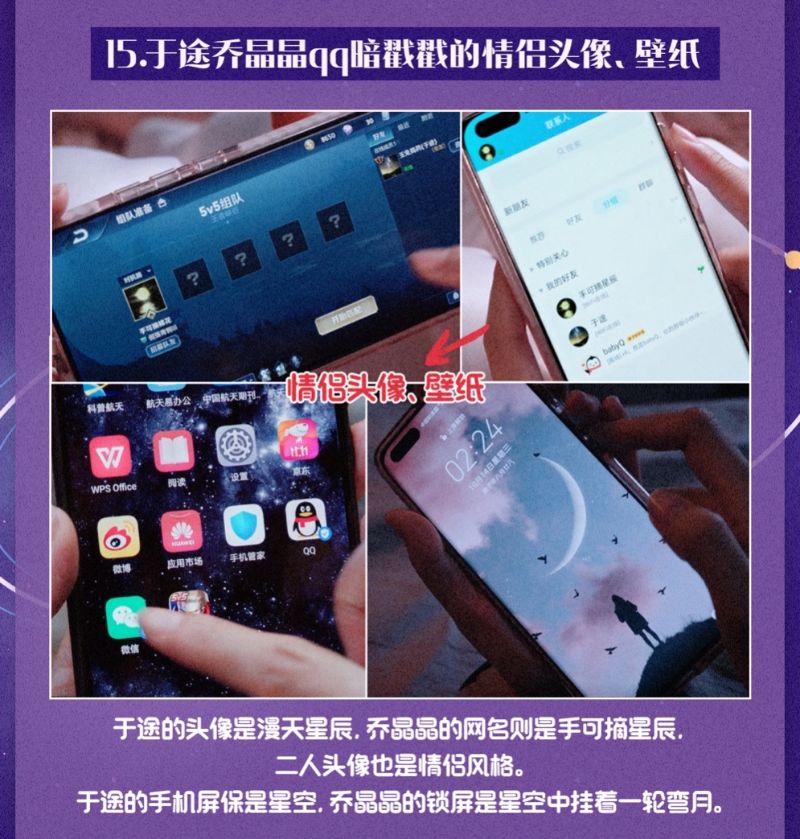 15. 于途喬晶晶qq用的是情侶頭像和壁紙,于途的頭像是滿天星辰、喬晶晶的網名則是「手可摘星辰」。于途的手機壁紙是漫天星空,晶晶的鎖屏則是星空中掛著一輪明月。