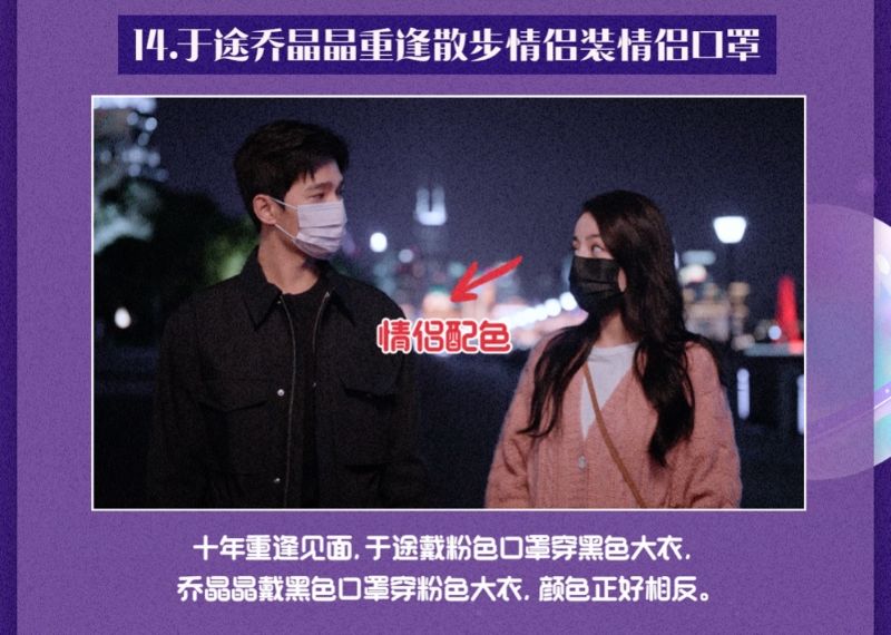 14. 于途和晶晶十年重複見面散步時,于途戴的是粉色口罩黑色大衣,而晶晶則是相反,兩人穿的是情侶裝。
