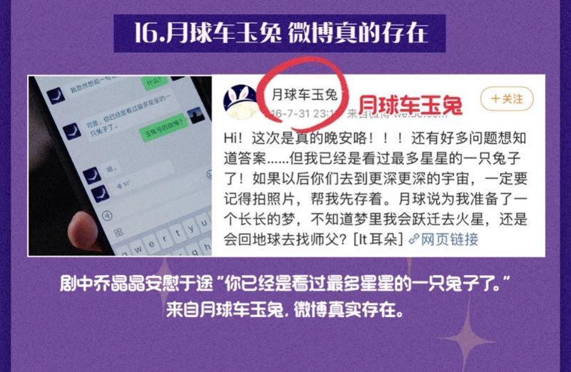 16. 劇中喬晶晶安慰于途:「你已經是看過最多行星的一只兔子了」,這是來自月球車玉兔的微博,是真實存在的哦!!!